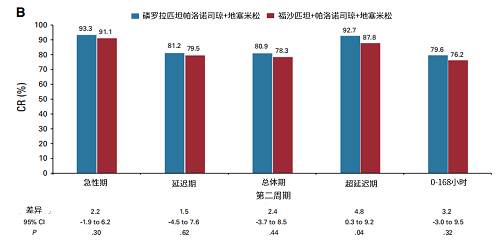 研究达到主要终点(第一周期总体期的CR率分别为77.7% vs 78.2%[95% CI:-6.7,5.0];单侧P<0.01)(图1)。连续两个化疗周期,磷罗拉匹坦帕洛诺司琼急性期和超延迟期的CR率均达到90%以上,高于FAPR+PALO,且第二周期疗效更佳(急性期:第一周期:91.2% vs. 89.9%,第二周期:93.3% vs. 91.1%;超延迟期:第一周期:90.3% vs 86.5%,第二周期:92.7% vs 87.8%)(图2、图3)。